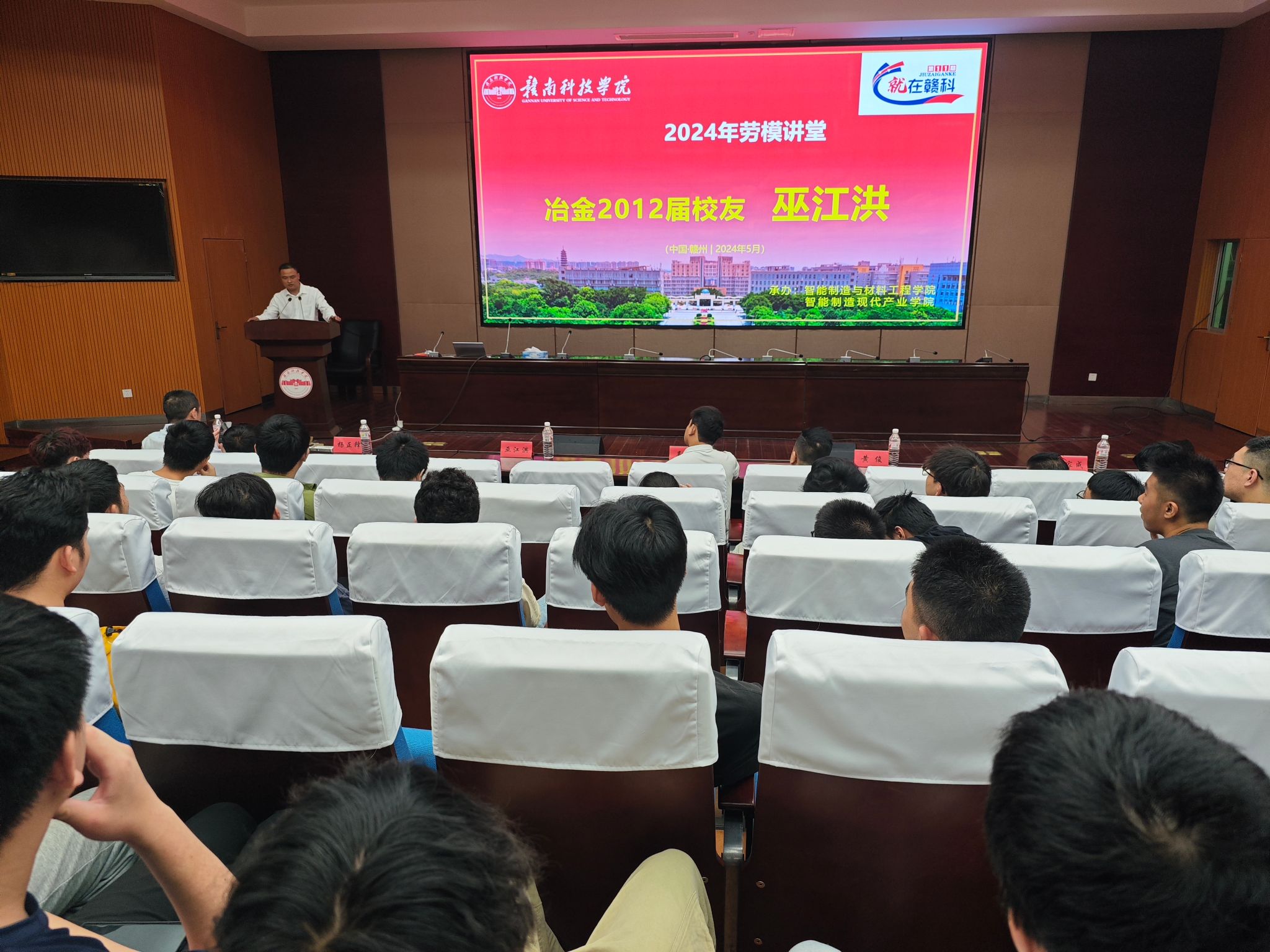5月4日,全国五一劳动奖章获得者巫江洪员工2024年劳模讲堂,公司行政负责人刘辉出席,师生代表近200人现场聆听。讲座由刘辉主持。