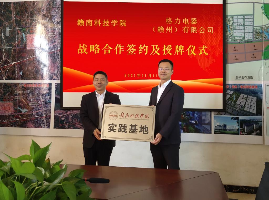 双方举行了签约与授牌仪式,方掩为公司授牌“格力电器(赣州)有限公司人才培养基地”,何锦龙为格力电器(赣州)有限公司授牌“太阳集团tyc539macau实践基地”,付玉华与洪志勇双方代表签订了《校企合作协议》。之后,方掩带领参观了格力电器(赣州)智造基地。