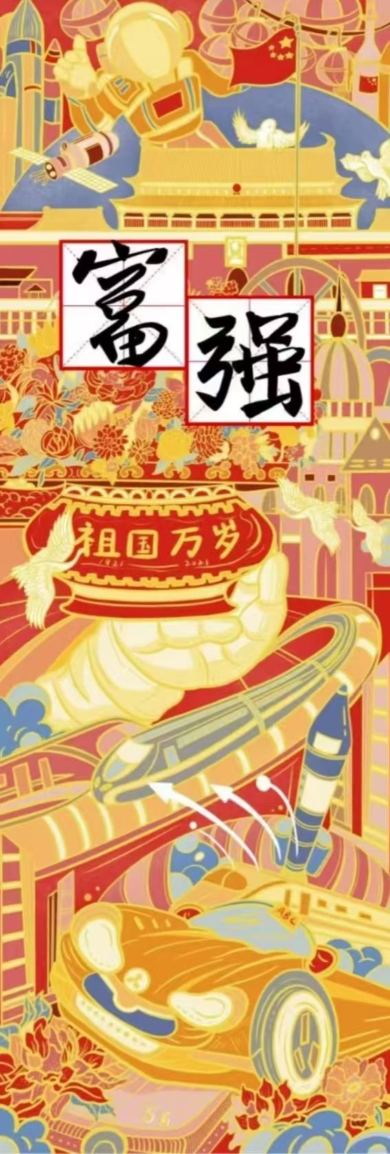 第二件事“富强”。革命精神永传不朽,红色基因代代相传,深刻把握红色资源的思想内涵和时代价值,青春献礼二十大,潜心创作出“富强”红色文化作品,讲述党的故事、革命的故事、英雄的故事,凝聚奋进新征程的强大力量。“富强”“富”是民之本,“强”是国之基,富强是时代的主题,是中华民族梦寐以求的美好夙愿。画中所绘,皆新中国之巨变,富强之体现,从机耕泥路到公路成网、铁路密布;从资源稀缺发展成西气东输、南水北调。今之中国,卫星升天,“蛟龙”入海,高铁飞驰,5G入网,目光所及之处,无不海晏河清,国泰民安。