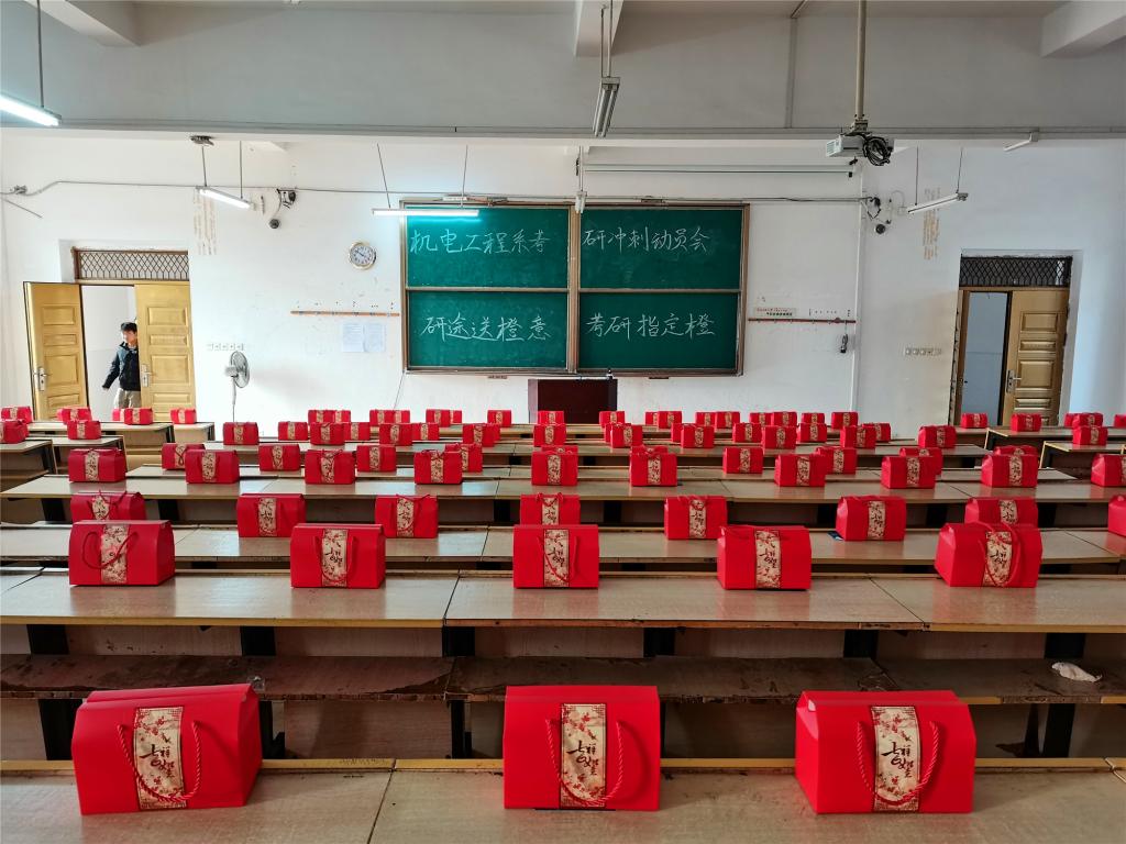 会议最后,老师给同学们献上祝福,为每位考研员工分发了脐橙小礼盒,“研”途送橙意,考研指定“橙”,礼盒中含有充满祝福意义的脐橙。为了给考研同学制造这份惊喜,老师们和学弟学妹们精心筹备,脐橙由老师亲自采摘,院、系领导及机电系全体老师亲笔为每位考研学子写下祝福语。如公司党委书记邓亦林为考研员工写下祝福语“橙”风破浪,马到功“橙”,公司经理何锦龙为机电系考研学子写下“奋斗的青春最美,考研的成功属你!”的祝福语。
