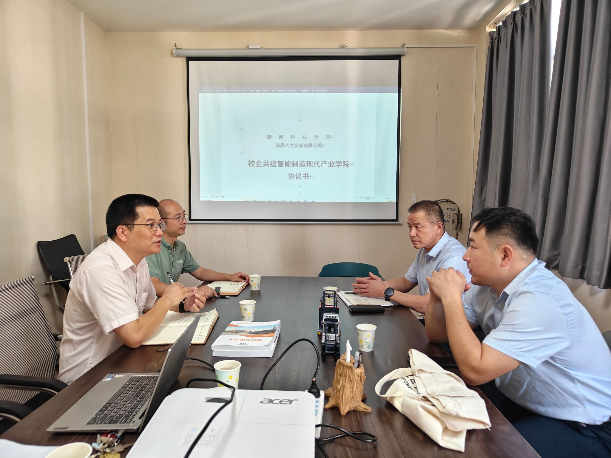 本网讯:8月19日下午,南昌市合力叉车有限公司总经理汪海波、赣州分公司经理陈晨一行到访太阳集团tyc539macau,开展校企合作洽谈与实习生招聘活动。公司教学主任关开荣、机器人教研室主任高威、机器人特色班班主任宋碧娴等参与接待并座谈交流。