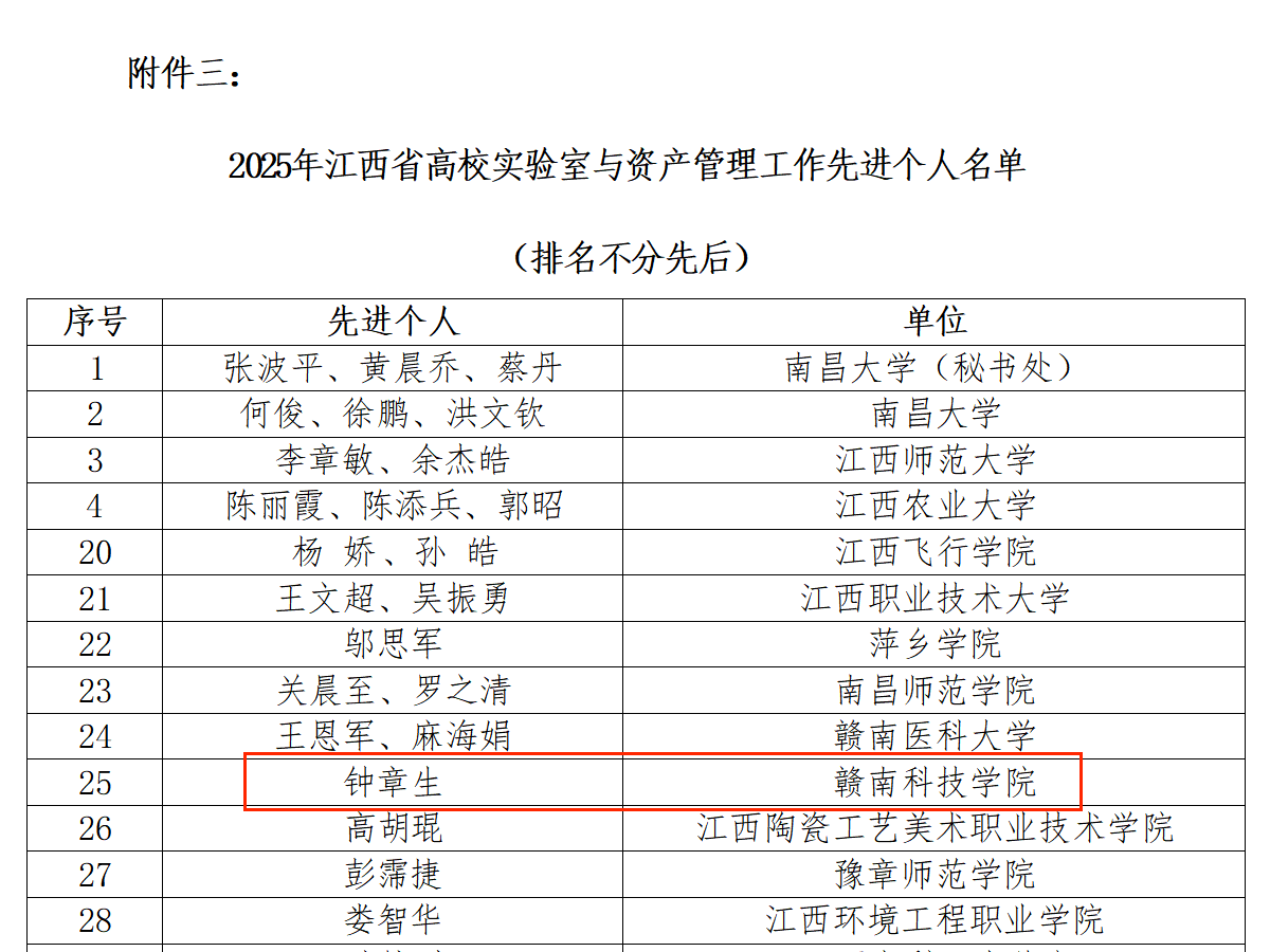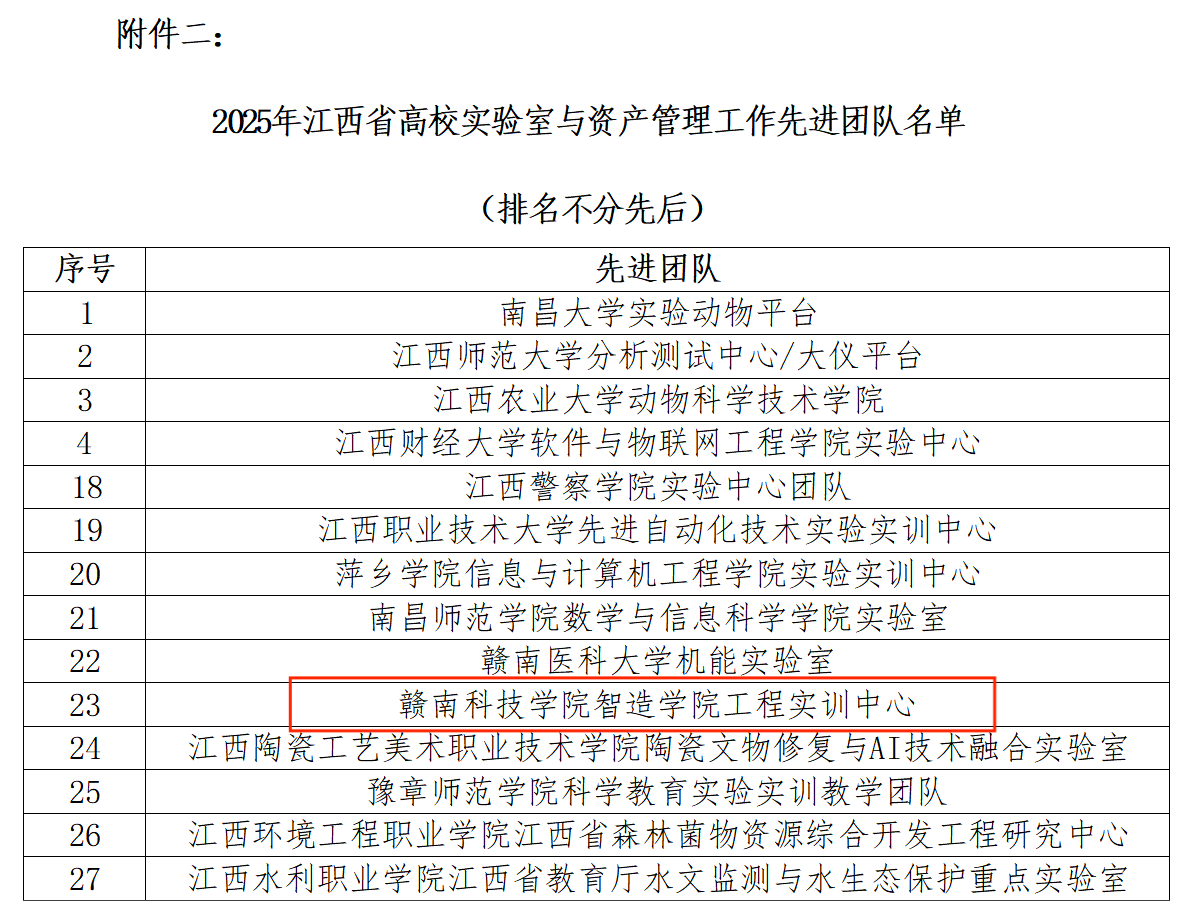 本网讯:近日,江西省高等教育学会发布《关于表彰2025年度全省高校实验室工作先进集体和个人的决定》(赣实发〔2025〕4号),智能制造与材料工程公司实训中心获评“高校实验室与资产管理工作先进团队”,信息公司钟章生老师荣获“高校实验室与资产管理工作先进个人”称号。
