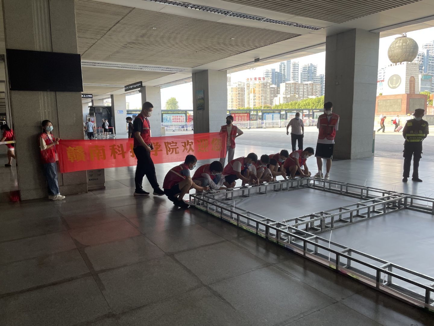 火车站接待处志愿者在布置迎新会场。