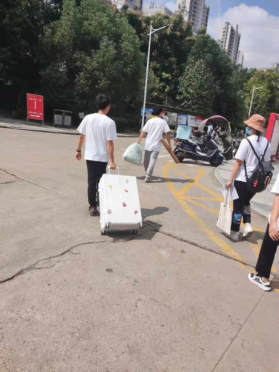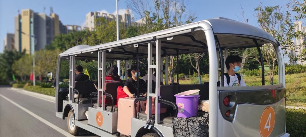 为方便新生到校报到,公司派出校车接送新生,校内设有摆渡车运送行李,还有志愿者帮新生扛重物,解决了家长担心孩子提不动行李的后顾之忧。