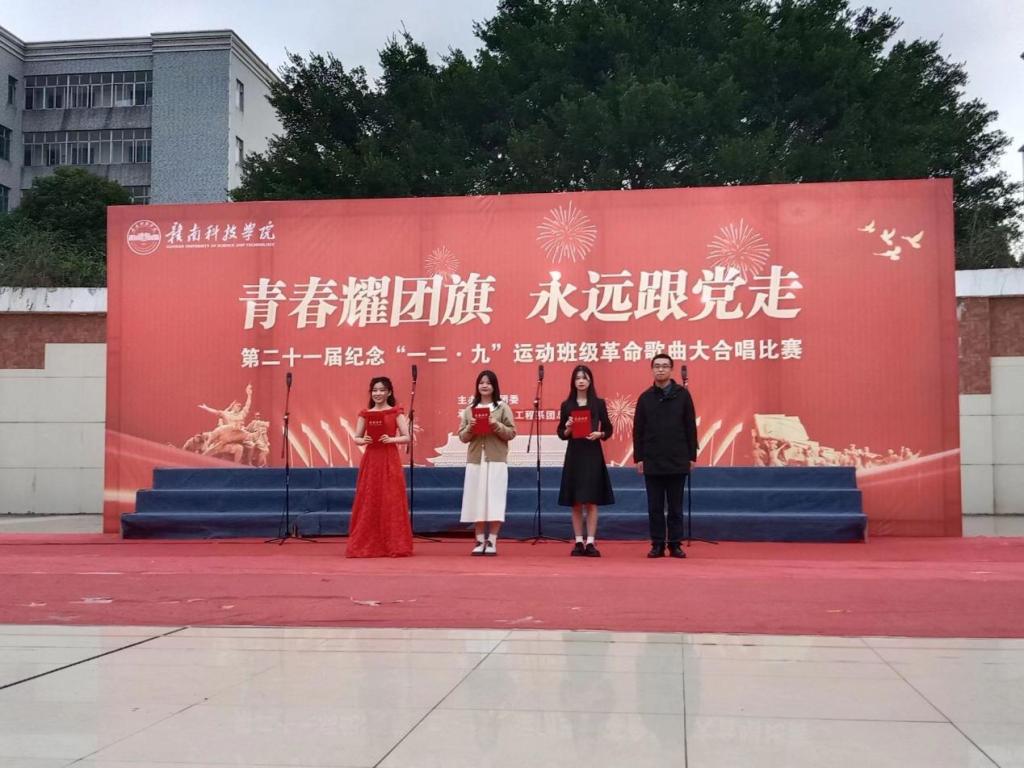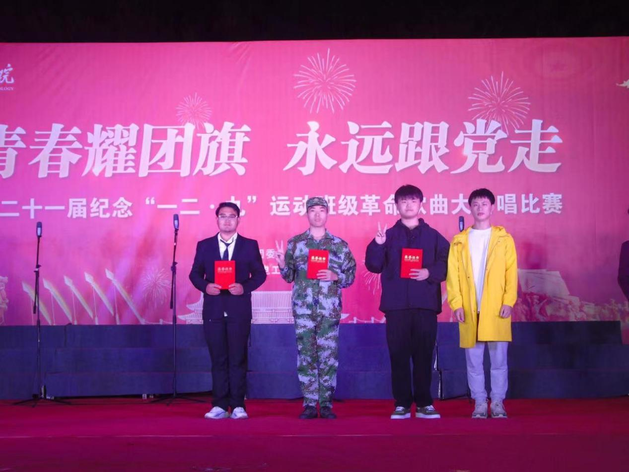 时间来到晚上七点,夜幕也已来临。机电工程系刘辉主任、肖志华老师和思政部徐帆老师也出席了此次比赛。在激烈而又紧张的比赛过程中,冶金222班以优异成绩斩获一等奖,机器人221班与材控221班荣获二等奖,冶金221班、机械223班与自动化222班荣获三等奖。冶金221班陈笑涵同学荣获“最佳指挥”称号,机器人221班黄景森同学荣获“最佳领唱”称号,材控221班王浩志同学荣获“最佳朗诵”称号。