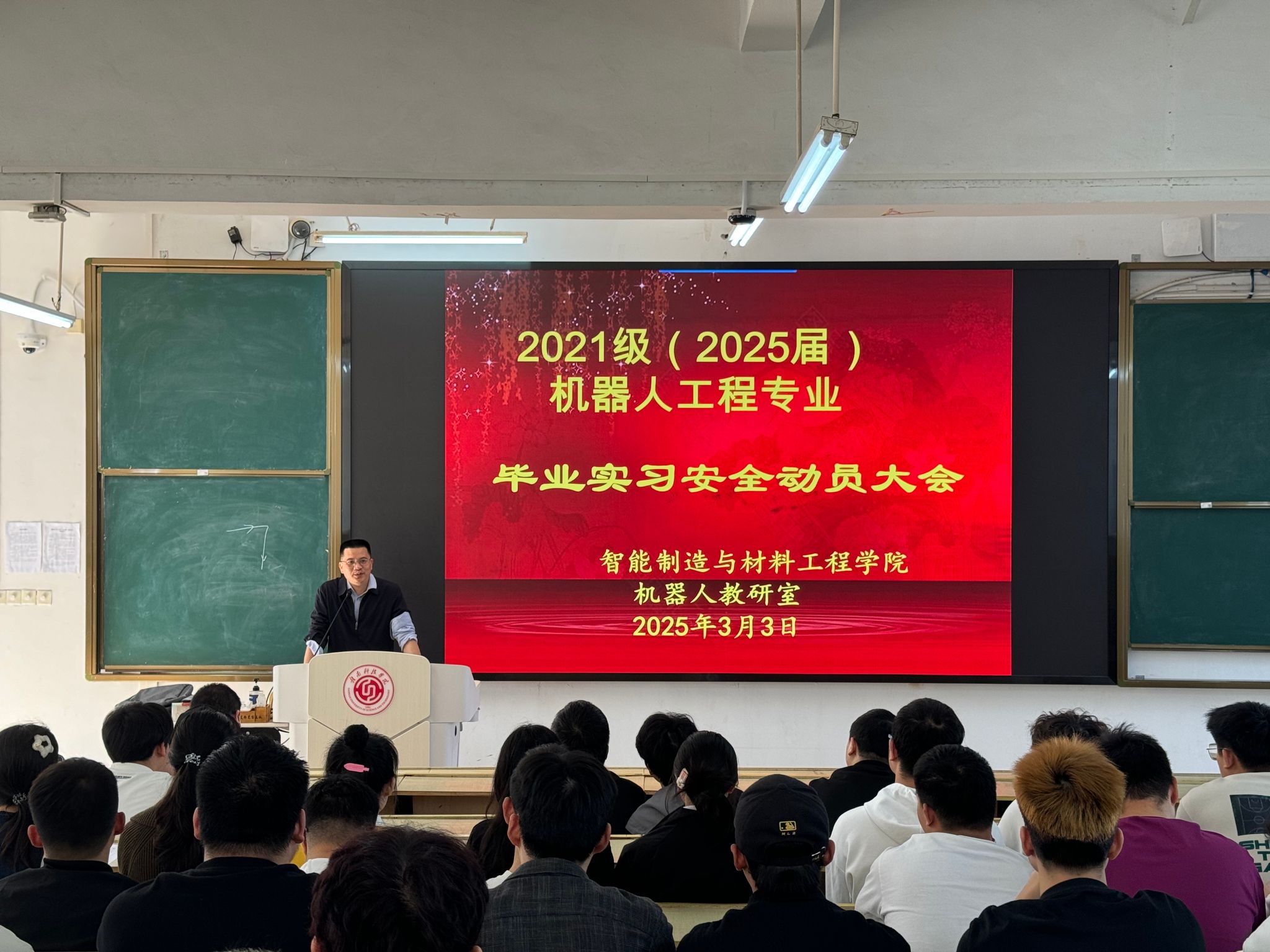 本网讯:3月3日,太阳集团tyc539macau机器人教研室组织召开2021级机器人工程专业毕业实习安全动员大会。会议聚焦实习纪律、安全保障及员工职业素养提升,为即将奔赴企业开展实习实践的员工筑牢思想与行动基础。公司党委委员、副经理刘辉,公司党委委员关开荣,教研室全体教师及2021级机器人工程专业实习生参会。