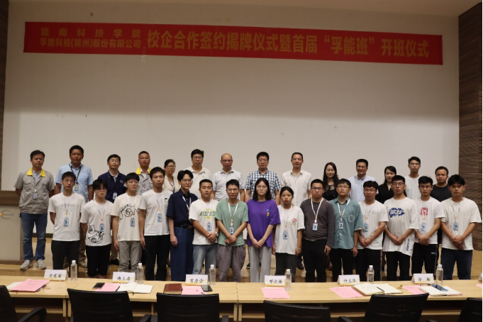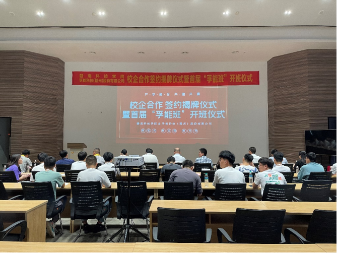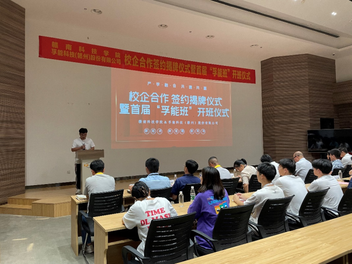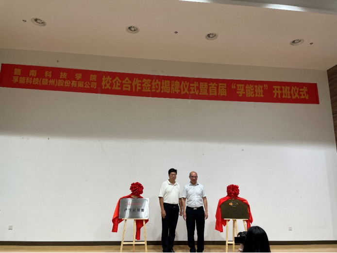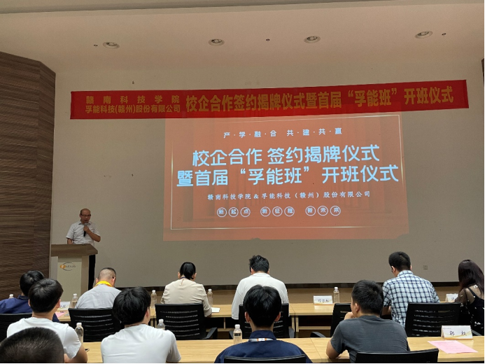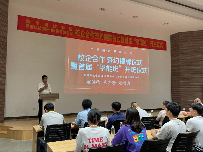 本网讯:7月12日上午,公司与孚能科技(赣州)股份有限公司(以下简称"孚能科技")校企合作签约仪式暨首届“孚能班”开班仪式,在孚能科技行政大楼报告厅第一会议室举行。孚能科技赣州基地总经理常彦学、副总经理谢玉香、生产部副总监方有福、电芯设备部高级经理程世祺、人力资源部经理邓青青、PACK工艺部经理邱利贵、电芯工艺部前段工艺经理钟晓华,公司过渡期管委会副主任邓亦林、委员付玉华,国交办主任涂敏,机电工程系主任刘辉、副主任关开荣,以及机电工程系李慧、张文俊、郭权等专业老师和“孚能班”15名员工出席仪式。