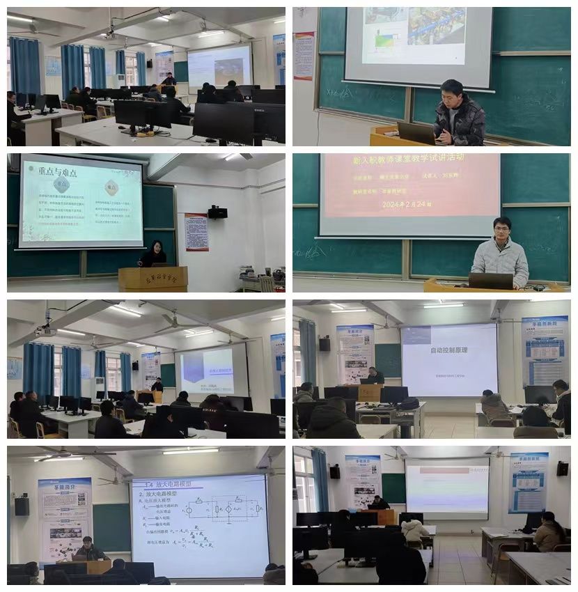 新能源教研室的林锦良、陈玉萍和李盛凯分别试讲了《材料化学》、《表面与界面化学》和《材料检测技术》三门课程;智能制造与机器人教研室的刘懿晨和汪志刚两位老师分别试讲了《机器人控制技术》、《工业互联网基础》;实训中心郝志红、何扬两位老师分别试讲了《材料制备方法》、《三维实体设计》;冶金教研室刘耀、刘东辉和邱森老师分别试讲了《塑料成型工艺与模具设计》、《稀土元素化学》、《有色冶金原理》;电气教研室曾钰清、曾希两位老师分别试讲了《模拟电子技术》、《自动控制原理》。