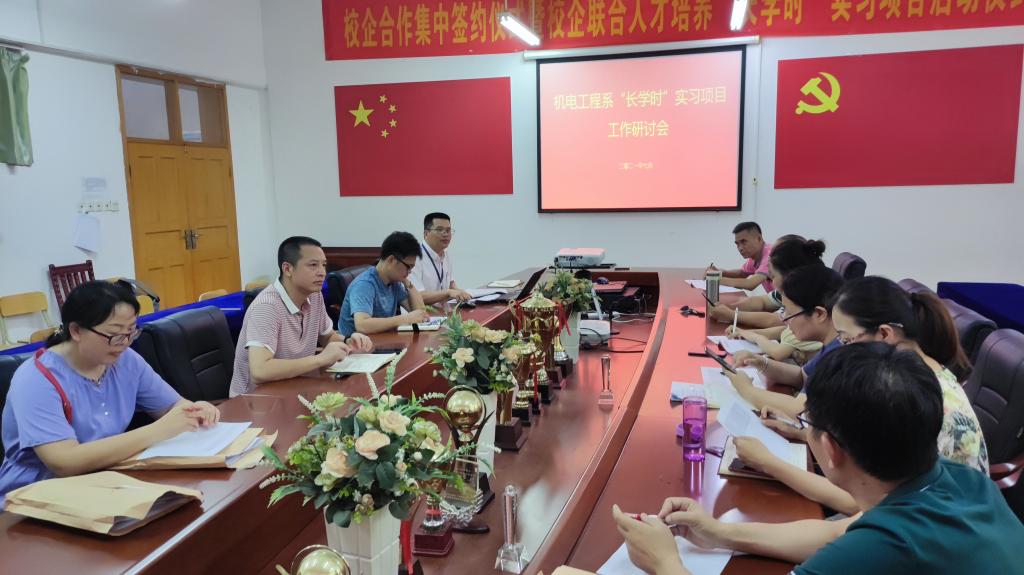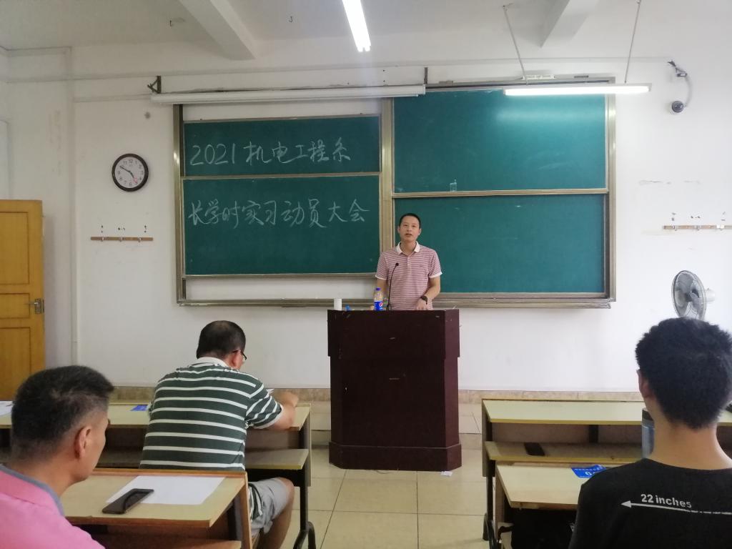 7月2日下午,机电工程系部署2021年“长学时”实习项目相关工作,在教学主楼八楼机电系党员活动室召开“长学时”实习工作研讨会,并在主教102教室召开了“长学时”实习动员大会。系主任刘辉、系党总支书记朱根松、副主任关开荣与肖志华、11位带队老师和2018级80多名实习员工参加会议,会议由副主任关开荣主持。